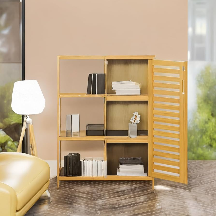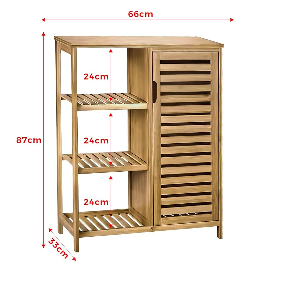 Skåpet kombinerar ett slutet utrymme med en dörr och 3 öppna hyllor för enkel organisering av toalettartiklar, handdukar, rengöringsmedel och andra badrumstillbehör. Den eleganta designen i den naturliga bambufärgen passar både moderna och klassiska inredningar.